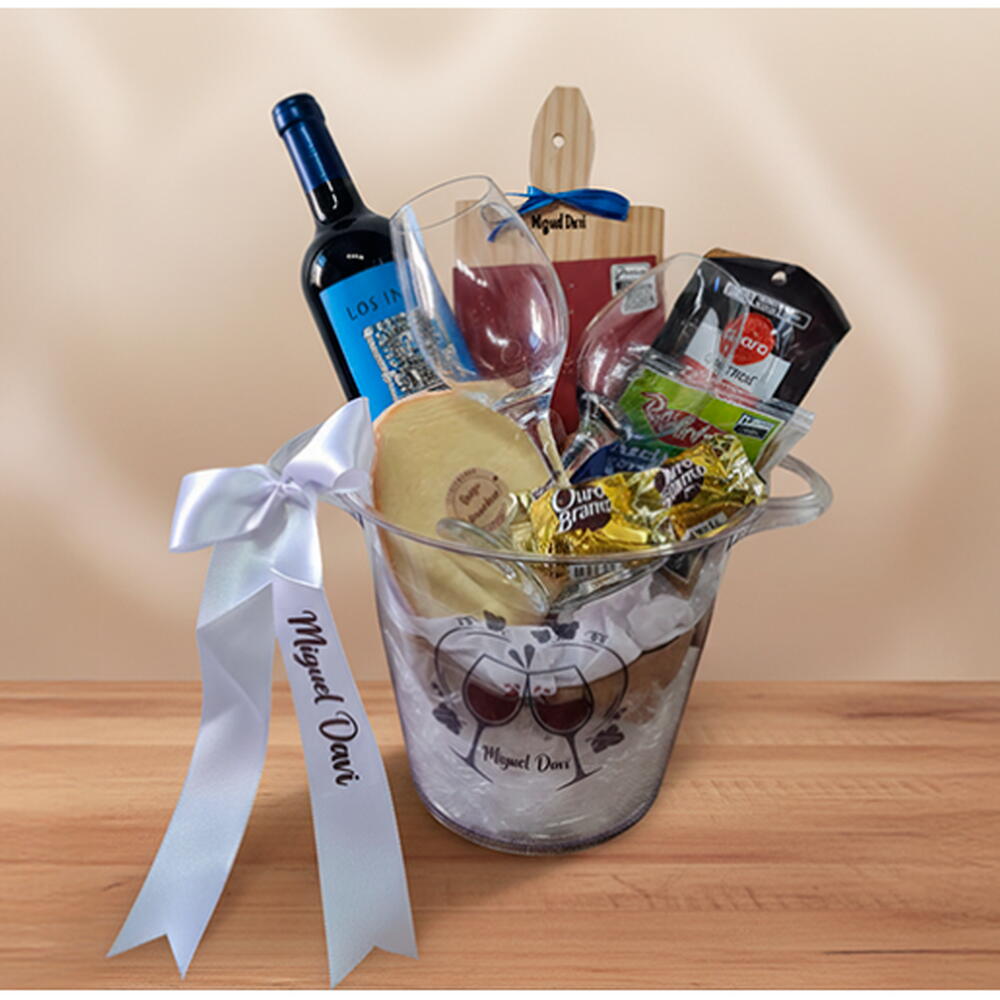 1 garrafa de vinho 750ml (Nacional, Chileno ou Argentino) 150g de queijo provolone 1 pacote de salame 100g 1 pacote de azeitonas 80g 1 caixa com 7 corações de chocolate ao leite da Cia do Cacau (70g) 2 taças para vinho 2 chocolates (Sonho de Valsa ou Ouro Branco) 1 tábua de madeira para frios personalizada com nome (26x14,5cm) 1 cartão dedicatória personalizado 1 balde em acrílico personalizado, 5L (28x19cm)