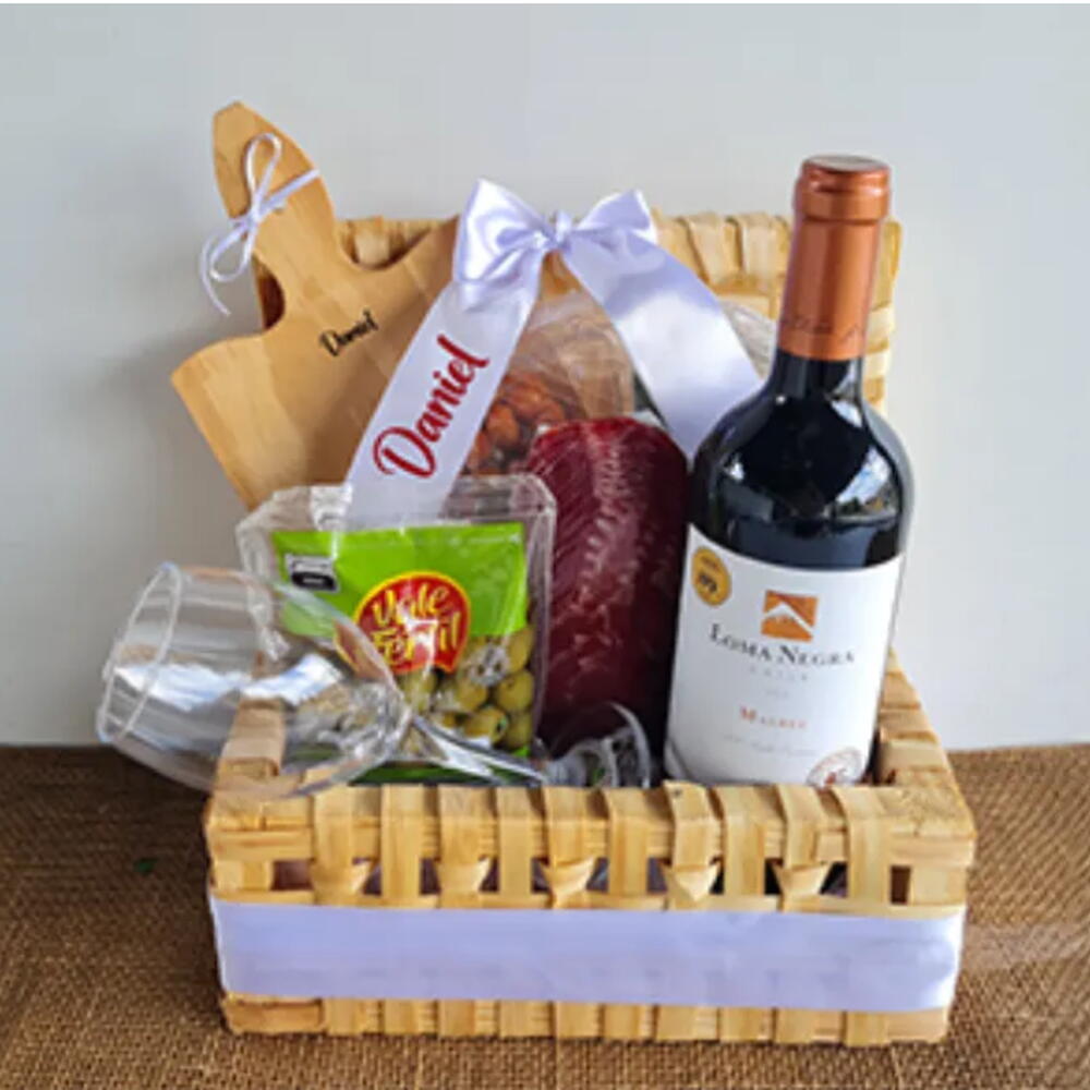 1 garrafa de vinho 750 ml (Nacional, Chileno ou Argentino) 1 pacote de salame ou linguiça 100g 1 pacote de azeitonas 80g Petisqueira com mix de amendoins: 50g de amendoim natural 50g de amendoim salsa e cebola 50g de amendoim pimenta 50g de amendoim churrasco 50g de amendoim salgado 1 tábua de madeira para frios personalizada com o nome do presenteado (25x14,5 cm) 1 taça 1 cartinha dedicatória personalizada 1 baú artesanal em palha, decorado com fita de cetim com nome gravado Embalado com plástico transparente e laço personalizado Medidas do baú (tampa aberta): Altura: 24 cm | Lateral: 15 cm | Frente: 25 cm | Parte inferior: 9,5 cm