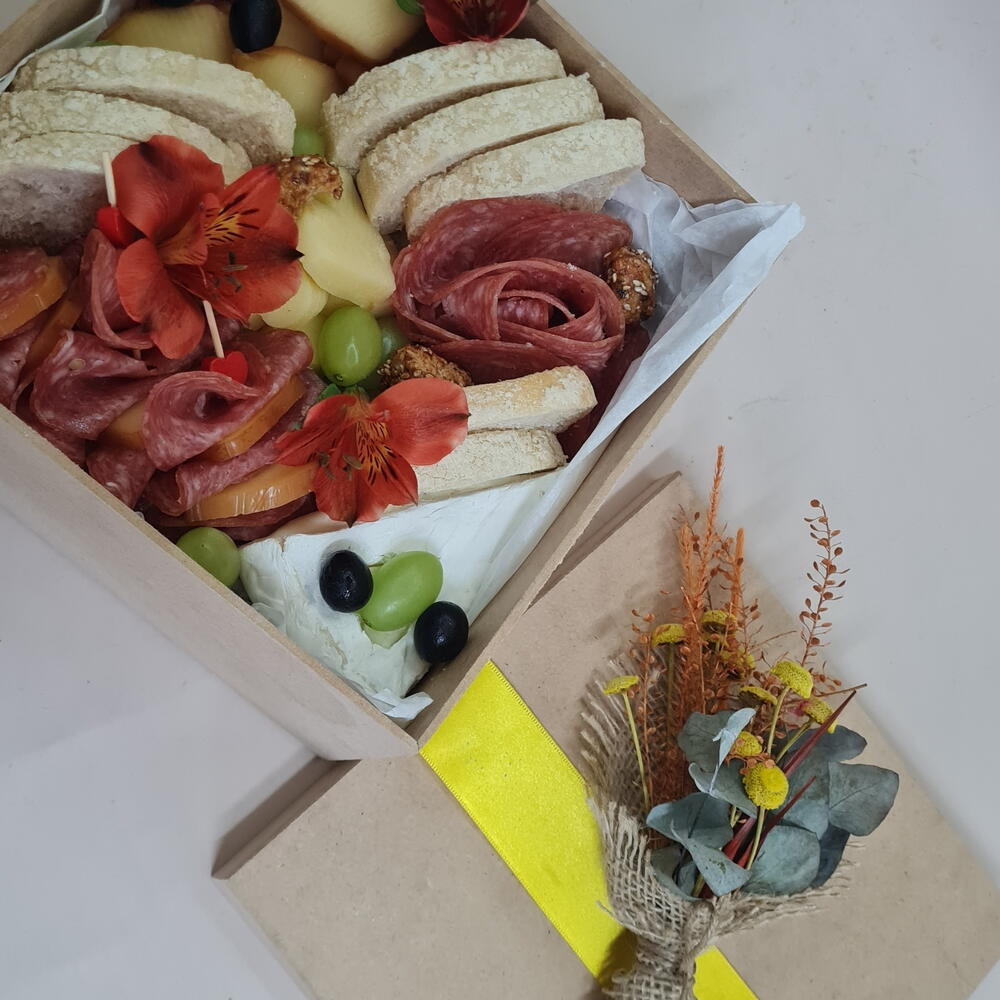 frutas - 2 un. pão - 1 un. salaminho 100 gr - 1 un. queijo tipos - 3 un. castanha de caju doce - 5 un. arranjo topo da caixa desidratado - 1 un.