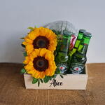 3 cervejas long necks Petisqueira com Mix de amendoins: 50g de amendoim natural 50g de amendoim salsa e cebola 50g de amendoim pimenta Embalagem com salame fatiado Arranjo com 2 girassóis Caixote tamanho 20x30cm - personalizado com nome gravado a laser, fechado com plástico transparente e corda de sisal. Ele contém 3 cervejas long neck de sua preferência, acompanhadas por uma deliciosa petisqueira com mix de amendoins em três sabores irresistíveis: 50g de amendoim natural, 50g de amendoim sabor salsa e cebola e 50g de amendoim sabor pimenta. Além disso, inclui uma embalagem com salame fatiado de alta qualidade, ideal para harmonizar com a bebida. Para tornar o presente ainda mais especial, o caixote conta com um charmoso arranjo de 2 girassóis, proporcionando um toque de cor e alegria. O caixote tem tamanho 15x25cm e é personalizado com nome gravado a laser, garantindo um acabamento sofisticado e exclusivo. A embalagem é finalizada com plástico transparente e corda de sisal, proporcionando um visual elegante e rústico.