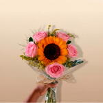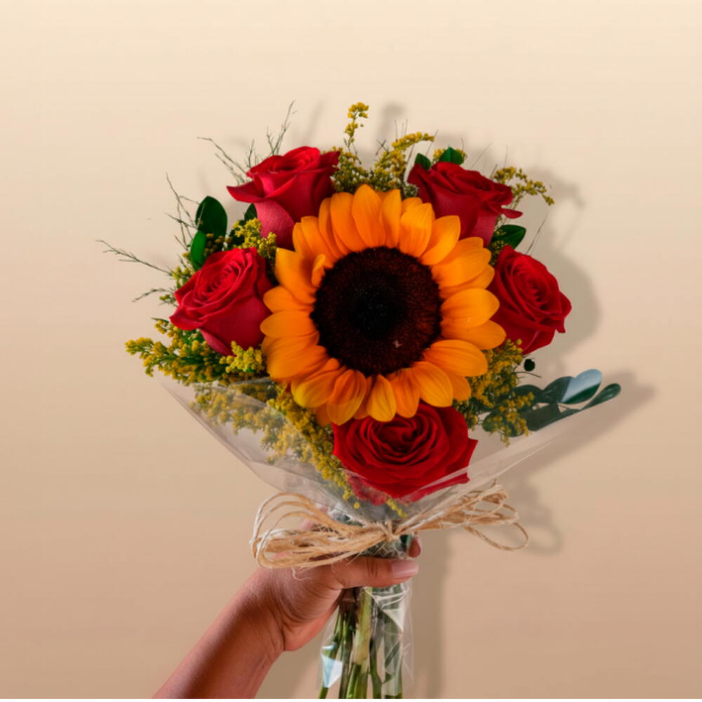 5 rosas naturais na cor de sua escolha (azul, branca, cor de rosa, vermelha, amarela ou lilás) 1 girassol radiante natural Plaquinha personalizada com nome ou foto Cartinha com sua mensagem personalizada (cortesia) Embalagem especial para arranjo floral O Buquê Felicidade é muito mais que um arranjo floral: é uma experiência sensorial que transforma sentimentos em cores e aromas. Cada rosa foi cuidadosamente selecionada para compor uma harmonia perfeita com o girassol radiante, criando uma combinação que celebra a vida, o amor e os momentos especiais que merecem ser eternizados.