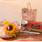 embalagem - 1 un. folhagens - 1 un. girassol - 1 un. chocolate - 1 un. caneca - 1 un. laço - 1 un. cartão dedicatória - 1 un.