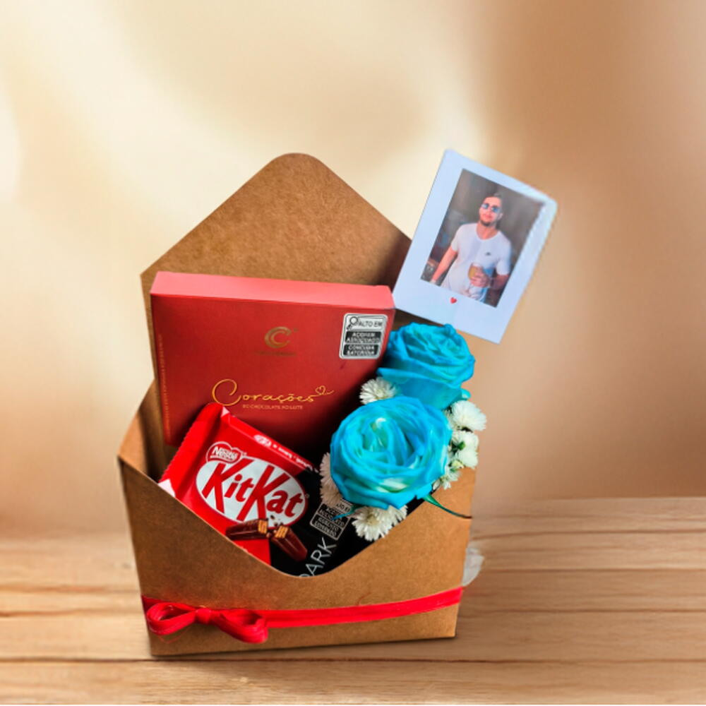 chocolate kitkat - 1 un. caixa de chocolate 7 corações (70g) - 1 un. arranjo floral natural com 2 rosa azuis - 2 un. caixa em material craft em formato de envelope - 1 un.