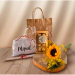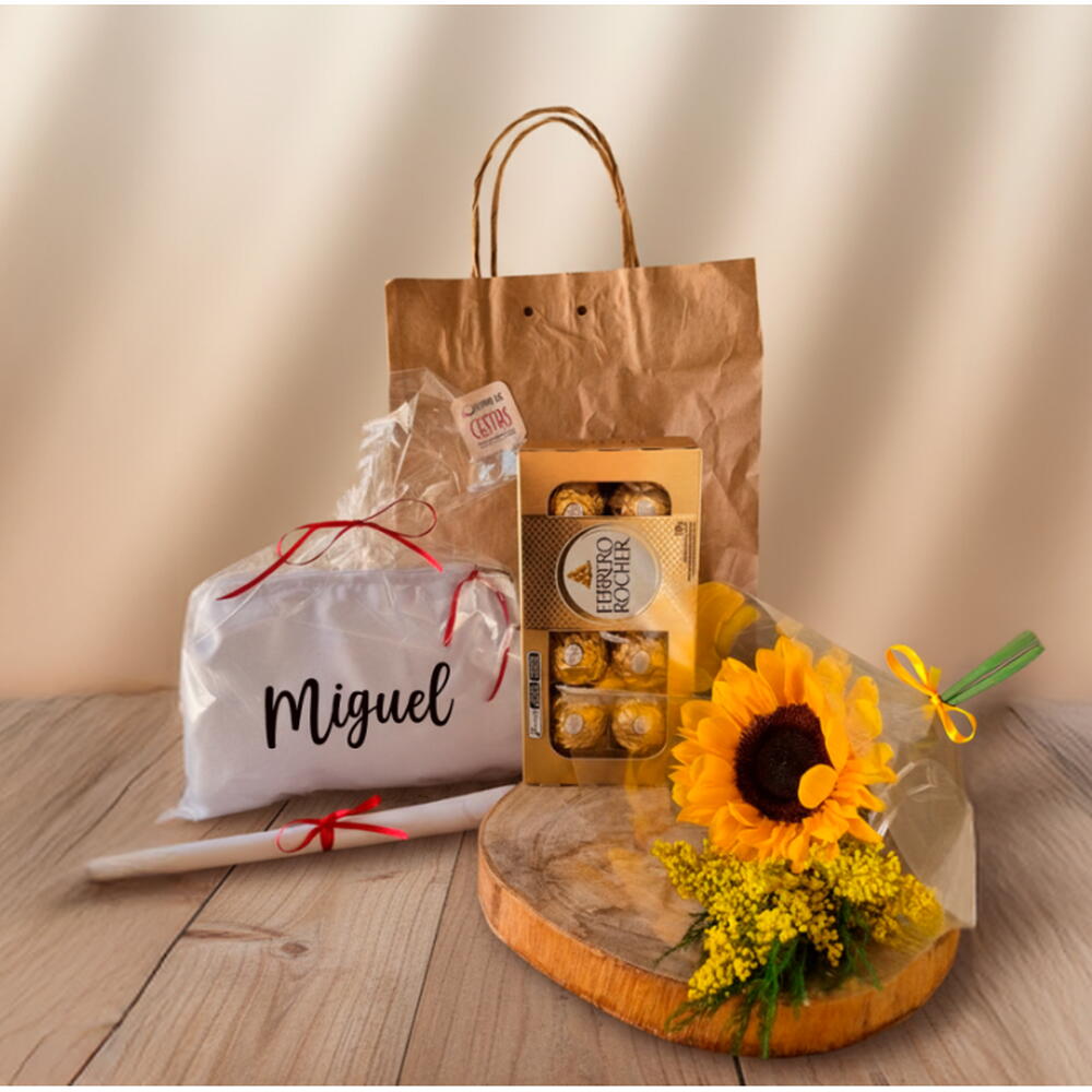 1 girassol solitário com folhagens - 1 un. 1 cartinha personalizada com sua mensagem - 1 un. 1 caixa de chocolates ferrero rocher com 8 unidades - 1 un. embalagem kraft premium com acabamento refinado - 1 un. fechamento com zíper) - 1 un. 1 necessaire personalizada com nome (tamanho 12x21 cm - 1 un.